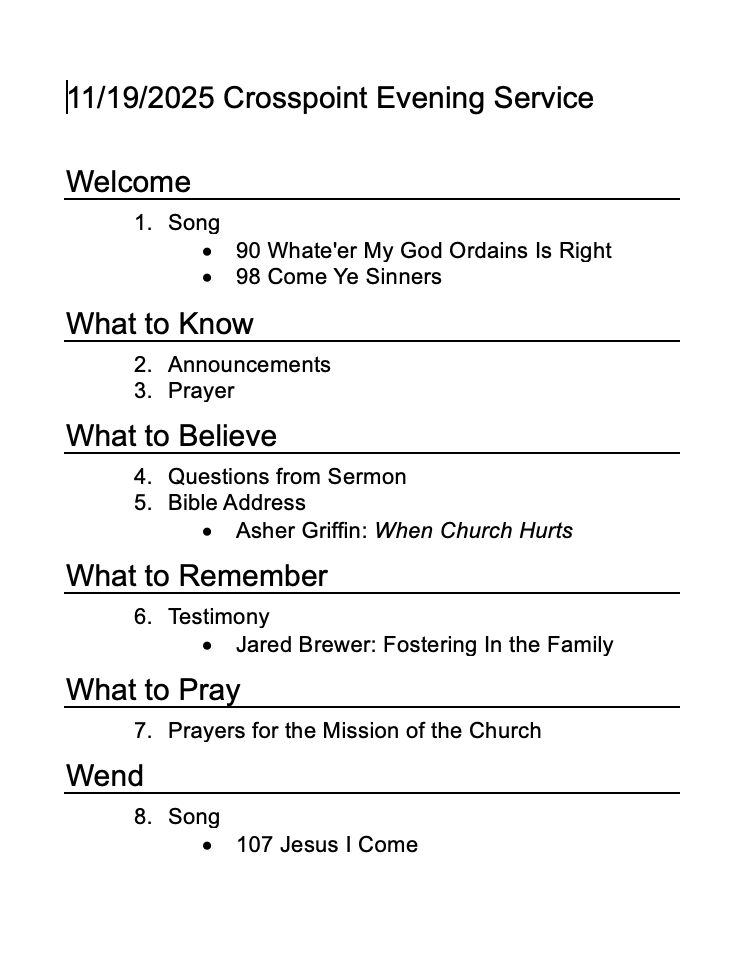 Regular Evening Service Agenda